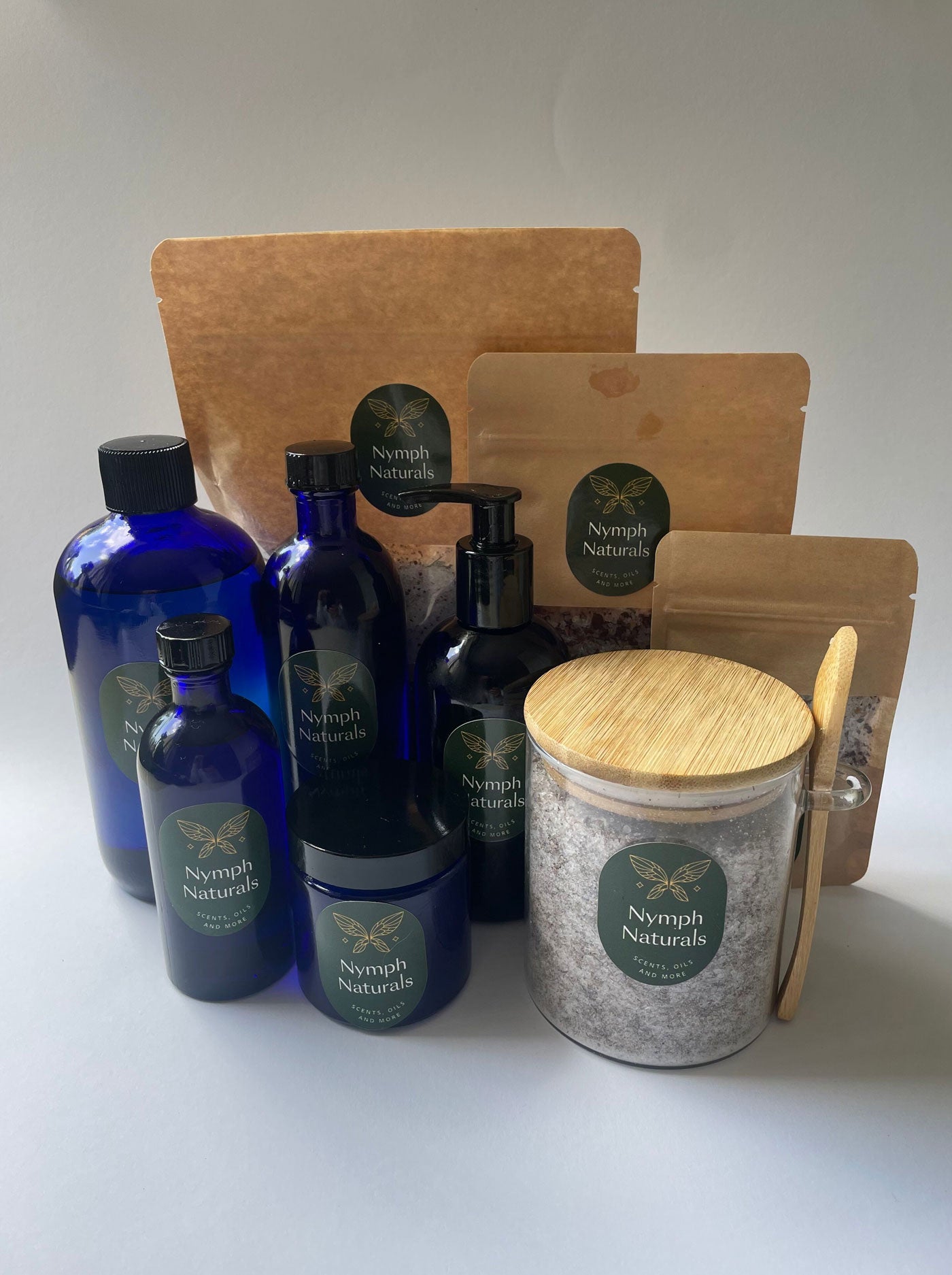 Nymph Naturals offers a thoughtfully curated range of botanical self-care products, including essential oils, bath soaks, body scrubs, and more. Packaged in elegant cobalt glass and eco-friendly kraft pouches, the collection reflects a commitment to natural wellness and sustainable luxury. Each product is crafted to evoke the spirit of nature with soothing aromas and earthy ingredients.